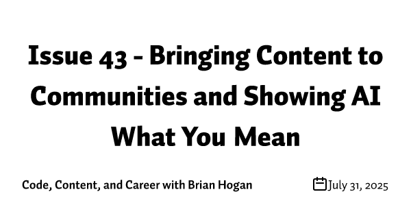 Find a blog post that gained traction and turn it into a narrated video walkthrough. Review a podcast episode or conference talk that resonated well and transcribe it into a blog post, or break it up into reels or shorts you share on various social platforms. Turn a strong tutorial into a workshop or even a "meetup in a box," a slide deck and talk track you can give to people to present at their user group on your behalf.